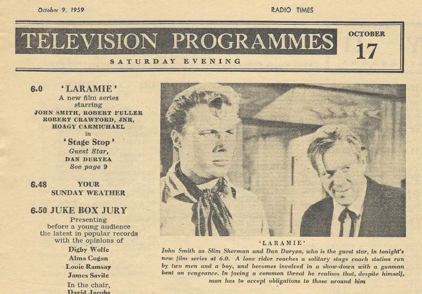 In the UK The Radio Times was the premier TV magazine for the BBC back in 1959. In those days there were only 2 channels (BBC and ITV) and each channel had its own magazine.Laramie was shown on the BBC launching on October 17th 1959- these are 2 articles from the Radio Times promoting the launch of Laramie.