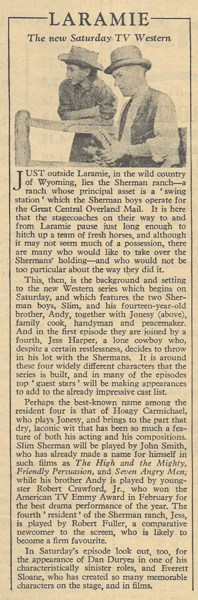 In the UK The Radio Times was the premier TV magazine for the BBC back in 1959. In those days there were only 2 channels (BBC and ITV) and each channel had its own magazine.Laramie was shown on the BBC launching on October 17th 1959- these are 2 articles from the Radio Times promoting the launch of Laramie.